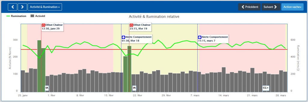 En cas d’anomalie, sur un ou plusieurs indicateurs (rumination, ingestion, intensité de l’activité, repos), l’éleveur reçoit une alerte comportement et peut intervenir rapidement sur les animaux à problèmes. L’impact de cette rapide intervention sur la production laitière et l’expression des chaleurs est non négligeable.