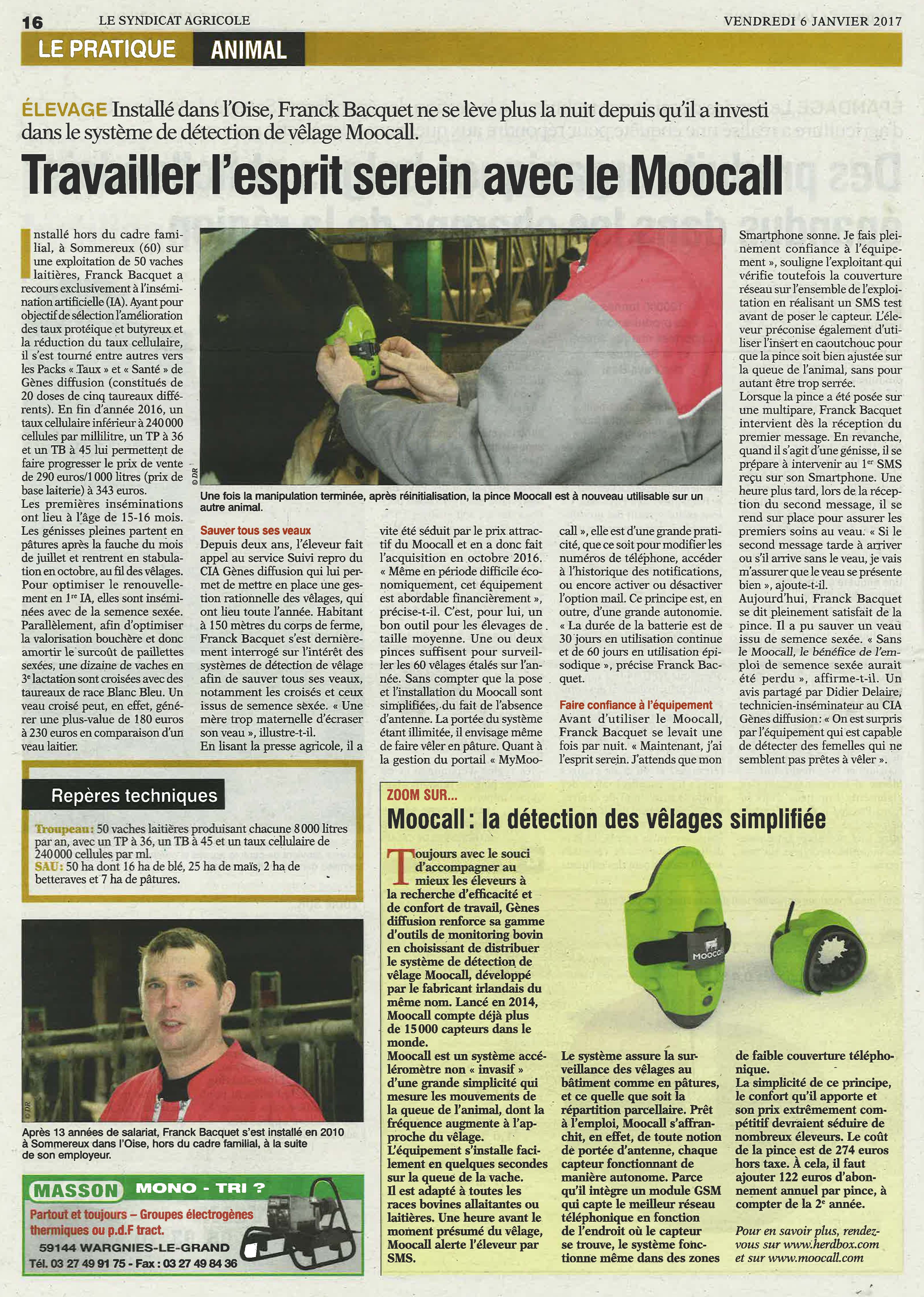 Installé dans l'Oise, Franck BACQUET ne se lève plus la nuit depuis qu'il a investi dans le système de détection de vêlage MOOCALL. La simplicité de ce principe, le confort qu'il apporte et son prix extrêmement compétitif, ont déjà séduit de nombreux éleveurs.